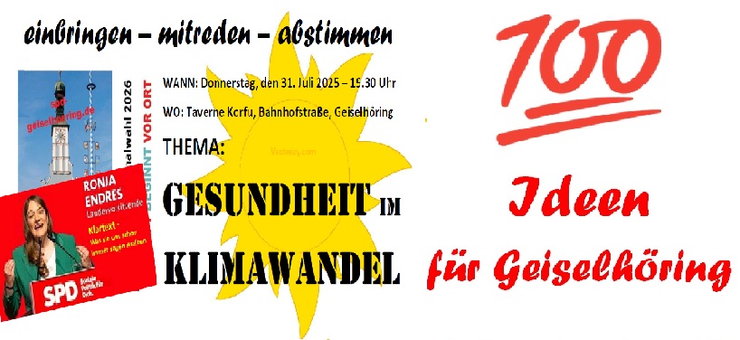 Am 31. Juli lädt die Geiselhöringer SPD zu einer weiteren „100 Ideen für Geiselhöring“-Veranstaltung in die Taverne Korfu ein. Thema ist dieses Mal die „Gesundheit im Klimawandel“. Unter anderem geht es um ein Hitzeschutzkonzept für Geiselhöring. Mit den Teilnehmerinnen und Teilnehmern diskutiert die BayernSPD-Vorsitzende Ronja Enders, die bereits bei der DIALOG-Veranstaltung zur Pflege ihre Fachkompetenz eingebracht hatte.
