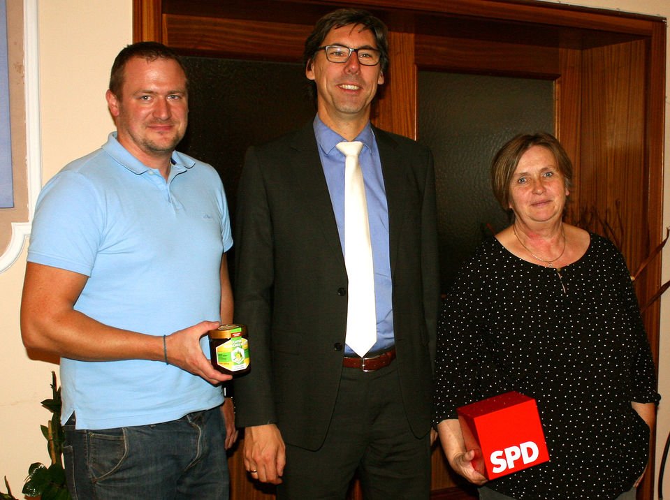 Bedankten sich mit einem Glas Geiselhöringer Honig bei Referenten Dr. Olaf Sommerfeld (Mitte): SPD-Ortsvorsitzender Michael Wittmann (li.) und seine Stellvertreterin Barbara Kasberger (re.)