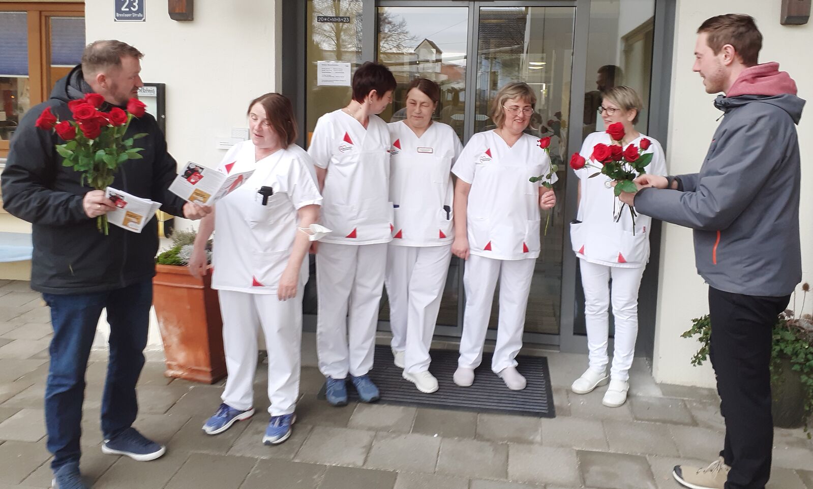 Anlässlich des Weltfrauentags 2023 überraschte die Geiselhöringer SPD, vertreten durch Stadtrat Ludwig Kerscher und SPD-Ortsvorsitzendem Michael Meister, gestern die Pflegekräfte des Seniorenheims Geiselhöring mit roten Rosen.