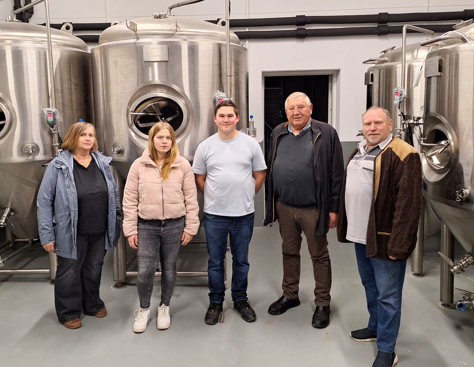 Überzeugten sich vor Ort von der Leistungsfähigkeit der Brauerei Richter: SPD-Ortsvorsitzende Barbara Kasberger (li.), Franz Bayer (2.v.re.) und Rainer Pasta (re.) mit Ricardo Richter (Mitte) und Eva Stöckl (2.v.li.)