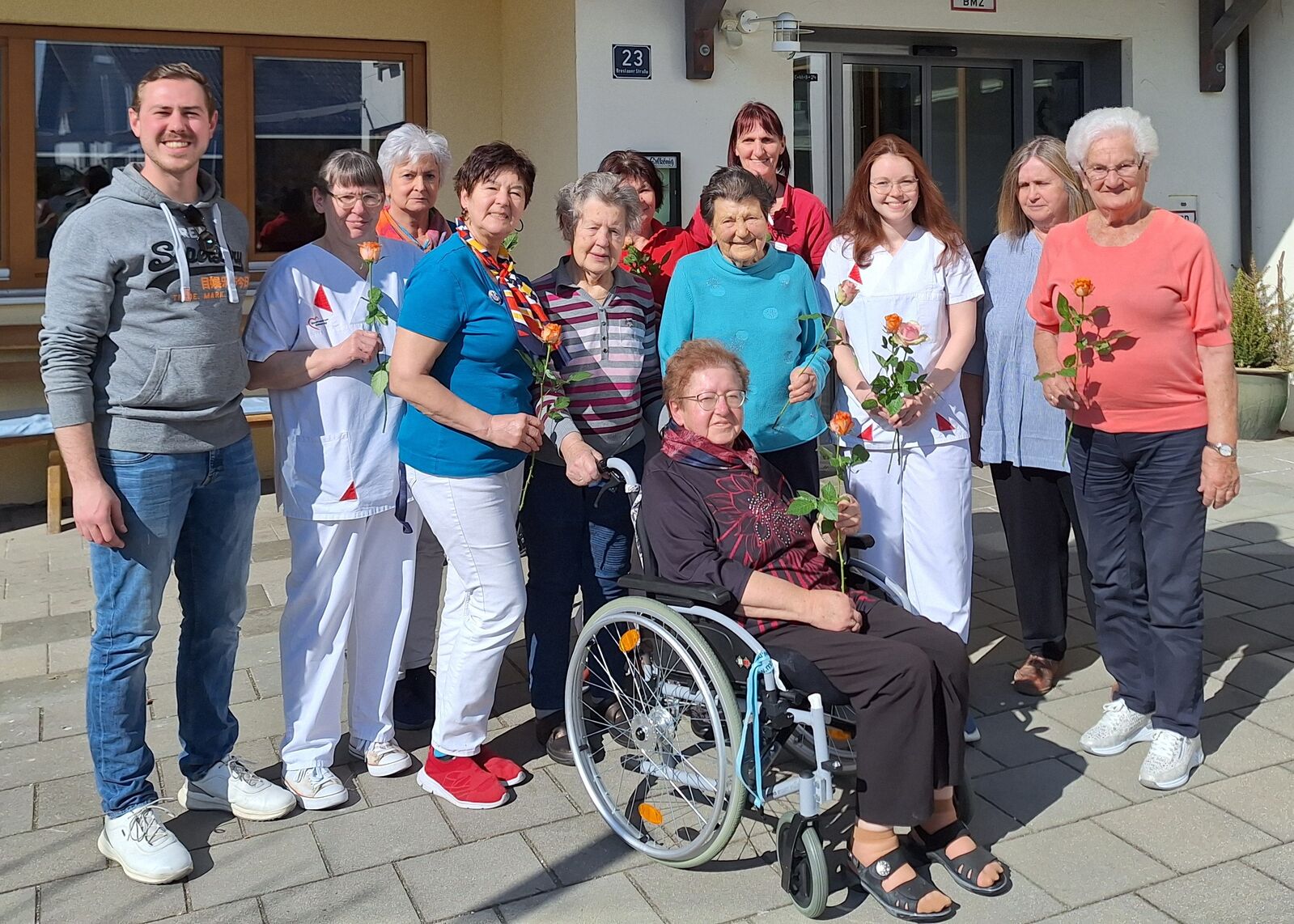 Stellvertretend für 200 Frauen in Geiselhöring bekamen auch die Beschäftigten im Seniorenheim wieder am 8. März ihre Rose zum Weltfrauentag – überreicht von Ortsvorsitzender Barbara Kasberger (2.v.re.) und Stadtrat Ludwig Kerscher (li.).