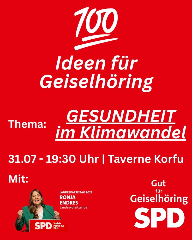 Am Donnerstag, den 31. Juli, lädt die Geiselhöringer SPD zu einer weiteren „100 Ideen für Geiselhöring“-Veranstaltung in die Taverne Korfu ein. Thema ist dieses Mal die „Gesundheit im Klimawandel“. Auch wenn es heute nicht so heiß ist, die nächste Hitzewelle kommt bestimmt und Geiselhöring braucht ein Hitzeschutzkonzept. Mit den Teilnehmerinnen und Teilnehmern diskutiert die BayernSPD-Vorsitzende Ronja Enders, die bereits bei der DIALOG-Veranstaltung zur Pflege ihre Fachkompetenz eingebracht hatte, und Alois Keller, Branchensekretär der Industriegewerkschaft Bauen-Agrar-Umwelt, denn auch „Arbeitgeber sollen für Sonnenschutz sorgen“. Moderiert wird die Veranstaltung von Bürgermeisterkandidat Ludwig Kerscher.