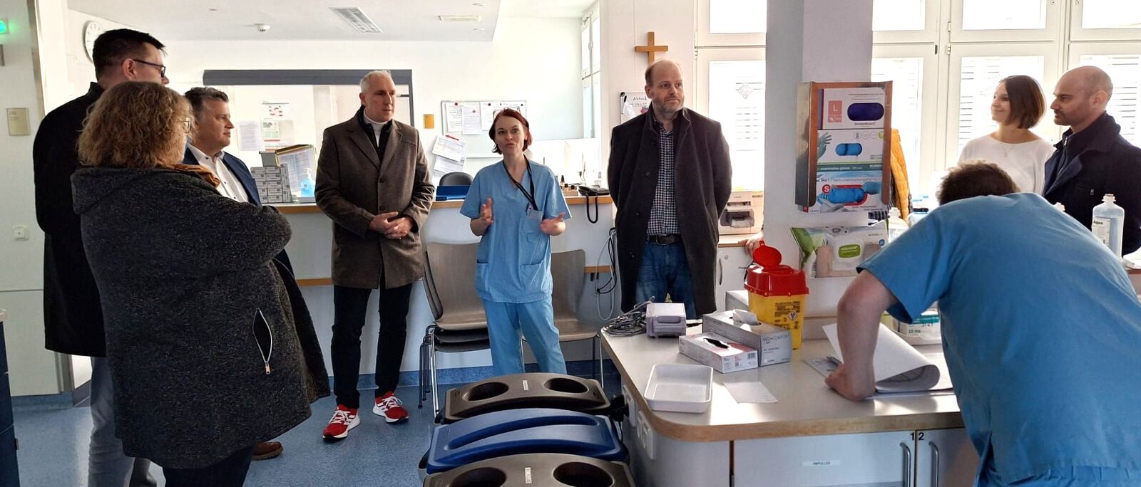 Information vor Ort – Bereichsleiterin Grit Hädrich (Mitte) und Verwaltungsleiter Stefan Fuchs (6. v.re.) stellten den Gästen die Intensivstation im Klinikum Bogen vor. Mit dabei (v.l.) Bürgermeisterkandidatin Claudia Ebner, Landratskandidat Oskar Saller, Carsten Träger, MdB, Vorsitzender der Landesgruppe Bayern, Christoph Schmid, MdB, Verteidigungspolitischer Sprecher, Pflegedienstleiterin Silvia Huber und Matthias Dornhuber, stellv. Vorsitzender der BayernSPD.