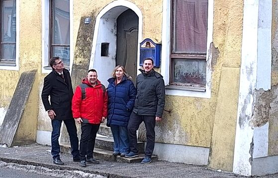 Bürgermeisterkandidat Ludwig Kerscher und Landratskandidat Oskar Saller sowie die beiden Ortsvorsitzenden Barbara Kasberger und Marco Lang vor dem historischen, aber mittlerweile heruntergekommenen Gritsch-Hof