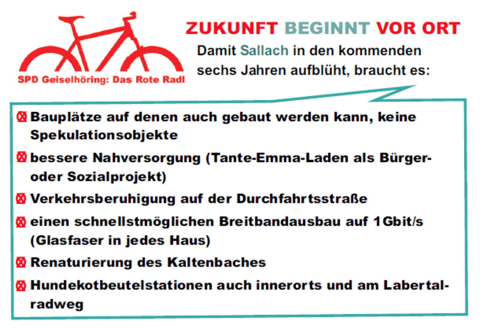 Mit der "Rotes Radl"-Aktion geht die Geiselhöringer einen neuen Weg, die Ortsteile in den Wahlkampf einzubinden. Statt der üblichen Abendveranstaltungen schlägt die SPD mit dem "Roten Radl" in den Ortsteilen auf und sammelt so Ideen, damit der Ortsteil aufblühen kann.