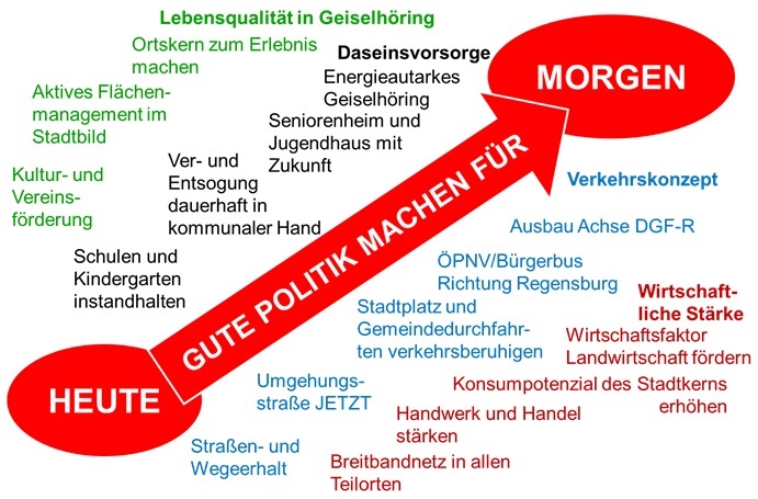 Lebensqualität in Geiselhöring verbessern durch gezielte und konstant hohe Förderung von Vereinsleben, kulturellem Programm und Ehrenamt. Die Stadt schöner gestalten durch aktives Management von Wohnstrukturen und Bebauungsplanung – mit innovativen Wohnkonzepten wie Mehrgenerationen-Wohnen und dezentral energieversorgten Baugebieten. Die Rückbesinnung auf den Ortskern für Geiselhöring ebenso wie für die Teilorte – dort soll in Zukunft die Musik wieder spielen, Stimmung sein, der Rubel rollen.
