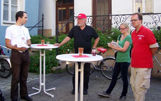 Auf dem historischen Stadtplatz von Geiselhöring legte die Radlergruppe am Infostand der örtlichen SPD eine Erfrischungspause ein. Die Geiselhöringer Genossen begrüßten die Radler um Rinderspacher und Perlak herzlich - Ortsvereins-Vorsitzender Johannes Faden lenkte in seinen Begrüßungsworten die Aufmerksamkeit auf die Defizite der schwarz-gelben Politik im ländlichen Raum: "Die Schulverbände der Staatsregierung führen auch hier bei uns zu Schulbus-Marathons für die Kinder und Kosten für die Kommunen, anstatt mit längere Grundschul-Zeiten Schulstandorte zu sichern - wie es die SPD tun würde", so Johannes Faden. Auch bliebe den Stadträten wegen der Freistaat-Sanierung auf dem Rücken der Kommunen kaum mehr kommunaler Gestaltungs-Spielraum, sondern nurmehr Mangel-Verwaltung. Mit Blick auf die derzeitige Integrations-Debatte rückte Johannes Faden dann die Aktionen der SPD Geiselhöring gegen Rechts in den Mittelpunkt: Mit einer T-Shirt Aktion weist die SPD derzeit auf rechtes Gedankengut aus Geiselhöring hin, das allen Integrationsbemühungen entgegensteht. „Rechtes Gedankengut, wie es von einem Versandhandel in Geiselhöring verbreitet wird, wollen wir nicht. Unser Gesellschaftsmodell sieht bunt aus. Geiselhöring wird bereichert von Menschen aus 25 Nationen, die friedlich und unproblematisch zusammenleben – so soll es auch bleiben“, stellte Johannes Faden fest. Er unterstrich die hervorragenden, teilweise preisgekrönten, Integrationsleistungen der Vereine in der Stadt, betonte jedoch gleichzeitig die Notwendigkeit, sich klar und öffentlich von rechtem Gedankengut zu distanzieren. "Nur so kann nach unser Gesellschaftsmodell langfristig nach innen und nach außen erfolgreich bleiben".