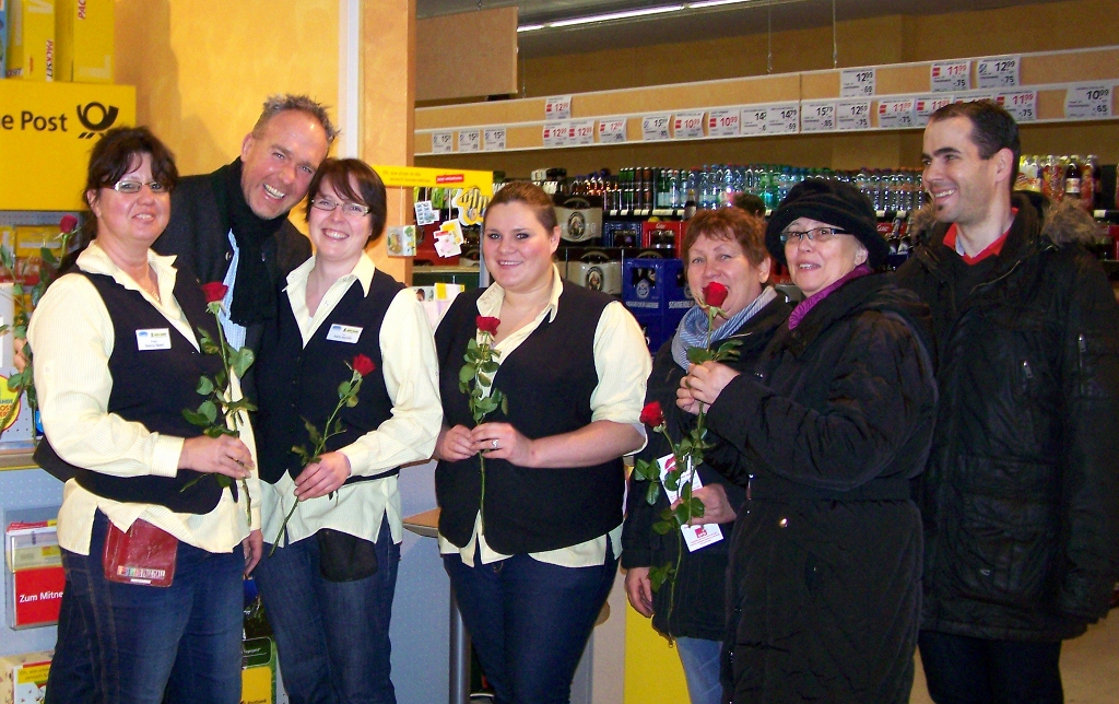 Landtagskandidat Peter Stranninger zusammen mit Mitarbeiterinnen im Fachmarktzentrum und Mitgliedern des OV-VorstandsWeltweit setzen sich Frauen am internationalen Frauentag am 8. März gegen Diskriminierung, für Menschenrechte und eine sozial gerechtere Welt ein. Seit vielen Jahren weist die Geiselhöringer SPD die Wählerinnen mit einer roten Rose auf diesen Termin hin und bekräftigt, dass Frauenziele nur erreicht werden können, wenn viele Frauen für ein politisches Mandat kandidieren und alle Frauen wählen gehen. Unterstützt wurde die Aktion heuer vom Landtagskandidaten der SPD, Peter Stranninger und binnen zwei Stunden waren 300 Rosen und Schoko-Küsschen an die Frau gebracht.