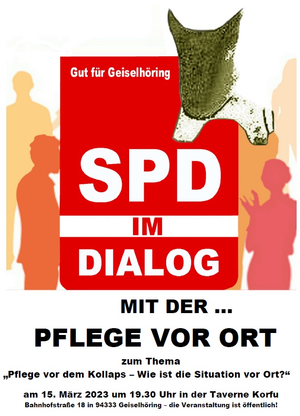 Bereits im Herbst 2018 stellte sich die Geiselhöringer SPD mit einer DIALOG-Veranstaltung unter dem Motto „Pflege in Geiselhöring - Wie kann der Pflegenotstand gestoppt werden?“ dem Thema Pflegenotstand. Mit einer weiteren DIALOG-Veranstaltung wollen wir mit Ihnen am 15. März 2023 um 19.30 Uhr in der Taverne Korfu dieses Thema wieder aufgreifen und mit Vertretern der Pflege im Kreisklinikum Mallersdorf, dem AWO-Seniorenheim in Geiselhöring sowie dem Pflegedienst Bachmeier diskutieren. Sie sind persönlich betroffen – dann diskutieren Sie doch mit!