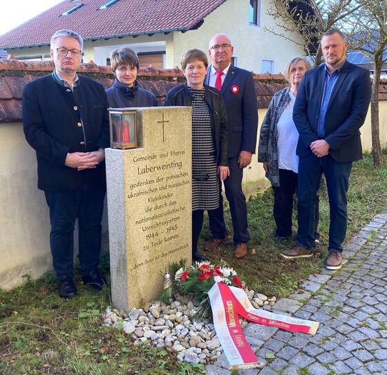 Gedachten der in Laberweinting ermordeten polnischen, ukrainischen und russischen Kindern von Zwangsarbeiterinnen: (v.l.) Josef Zellmeier, MdL, Vertreterin der Pfarrgemeinde, 3. Bürgermeisterin Maria Kick, Andreas Bialas, Vertreter des Generalkonsulats der Republik Polen in München sowie die beiden SPD-Ortsvorsitzenden Barbara Kasberger und Michael Meister in Vertretung des SPD-Arbeitskreises Labertal